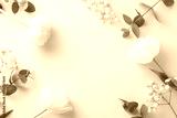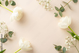 Deluxe holiday arrangement: Overhead snapshot of verdant eucalyptus, gypsophila, and white tulips elegantly spread on a beige ground, with vacant space for messaging
