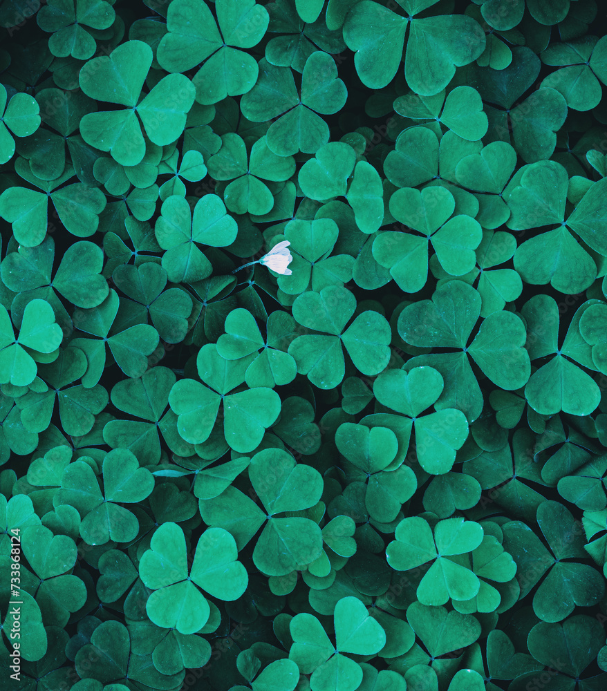 Background with green clover leaves for Saint Patrick's day. Background with a shamrock. Vintage film aesthetic.
