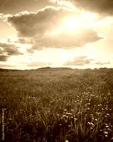 Sunrise or sunset on a field covered with young green grass and yellow flowering dandelions with a cloudy sky background in spring. Springtime landscape. Vintage film aesthetic.