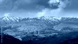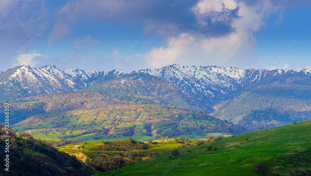 Hills covered with green grass and mountain top covered with snow and illuminated by the sun on a sunny spring day. Springtime mountains.