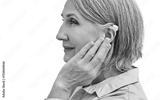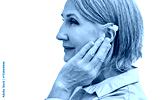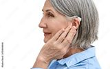 Middle-age woman with hearing impairment using hearing aid, side view. Hearing solutions for deafness people