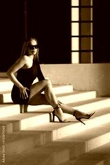 sexy young woman in a black dress wearing sunglasses on the stairs