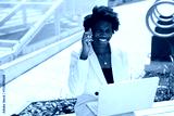 beautiful african female with laptop is calling by phone