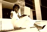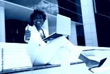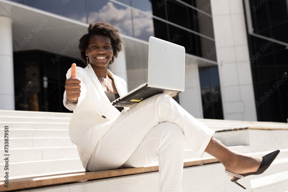 successful african female working with laptop with hand gesture