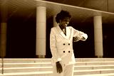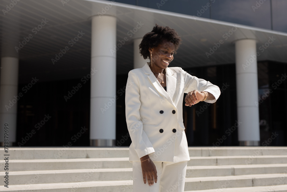 stylish african businesswoman in a white suit looks at her watch