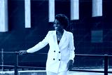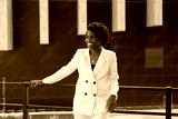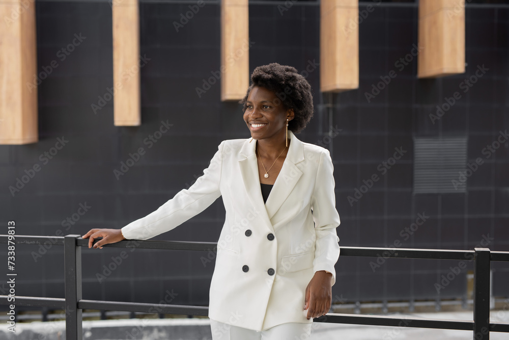 portrait of a happy curly African woman in a white suit