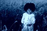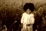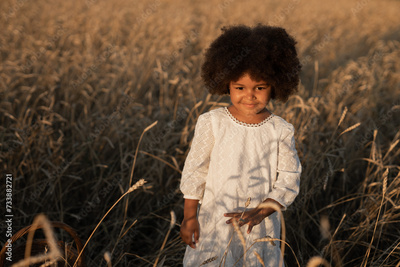 cute African girl in a white dress with a fluffy hairstyle walking along a summer field at sunset