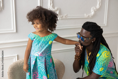 stylish african dad with dreadlocks kisses the hand of his beautiful happy daughter