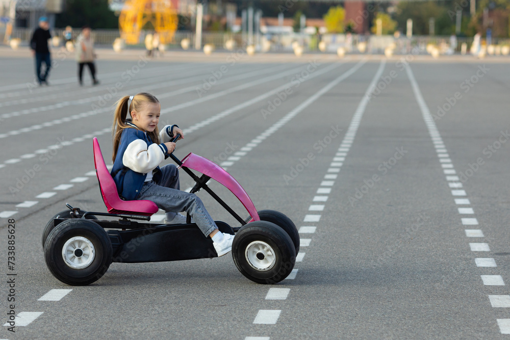 Little girl is riding on pedal karting. Child on a toy pedal car rides on a bike path outdoor, active children's vacation