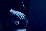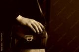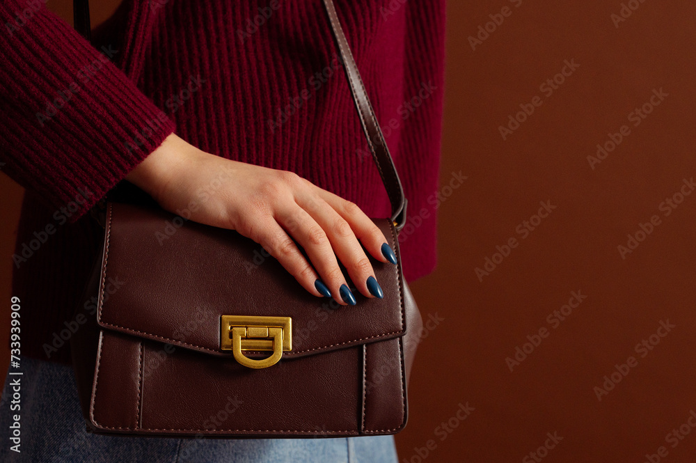 Close up photo of trendy brown leather shoulder bag, purse in fashionable outfit. Woman wearing knitted burgundy color sweater. Copy, empty, blank space for text