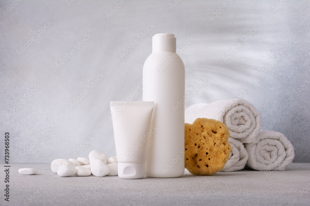 Plastic cosmetic’s bottle and tube of cream and shampoo