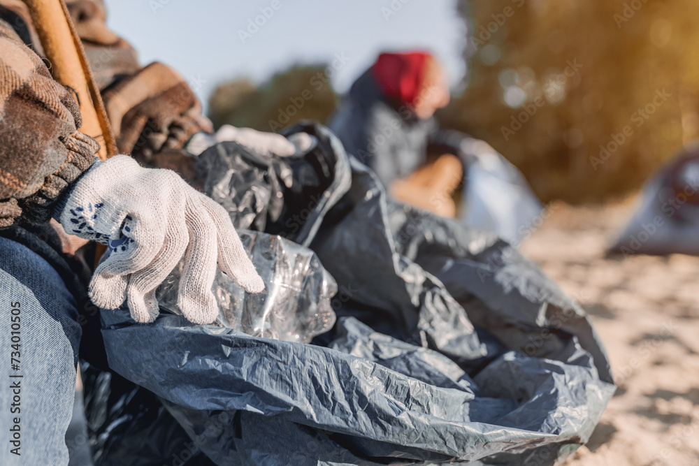 Close up shot of child in gloves collecting plastic bottles on the beach. Environmentalism, eco-system saving protection concept. Zero-waste way of living recycling