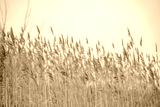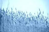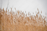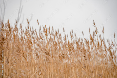 Overgrown dry cattail in winter. Herbaceous plants of lakes, marshes and rivers with brown cylindrical inflorescence. Selective focus.