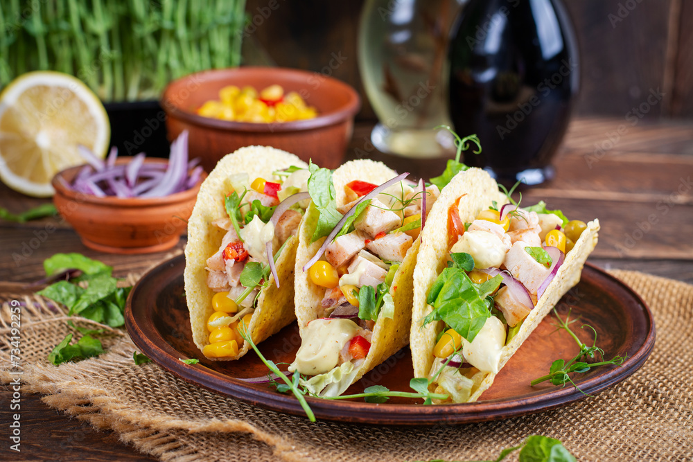 Mexican tacos with chicken meat, corn and salsa. Healthy tacos. Diet menu. Mexican taco.