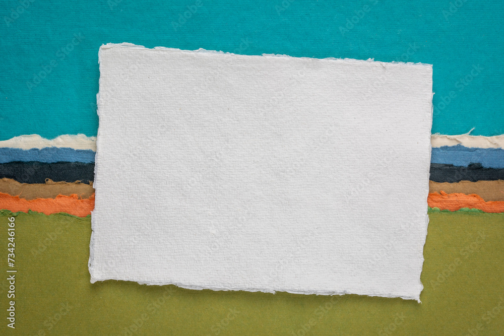small sheet of blank white Khadi rag paper from India against abstract landscape