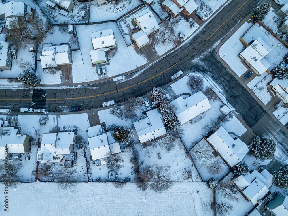 winter morning over a residential area of Fort Collins in northern Colorado with fresh snow, aerial view