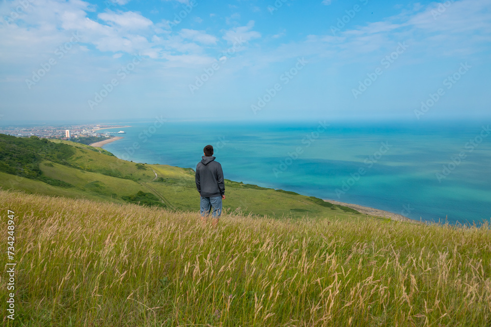 View from the cliff over green grass to the beautiful seaside town of Eastbourne
