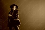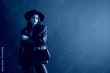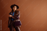 Fashionable confident woman wearing hat, faux leather suit blazer, pants, holding trendy purple purse, posing on brown background. Studio fashion portrait. Copy, empty, blank space for text