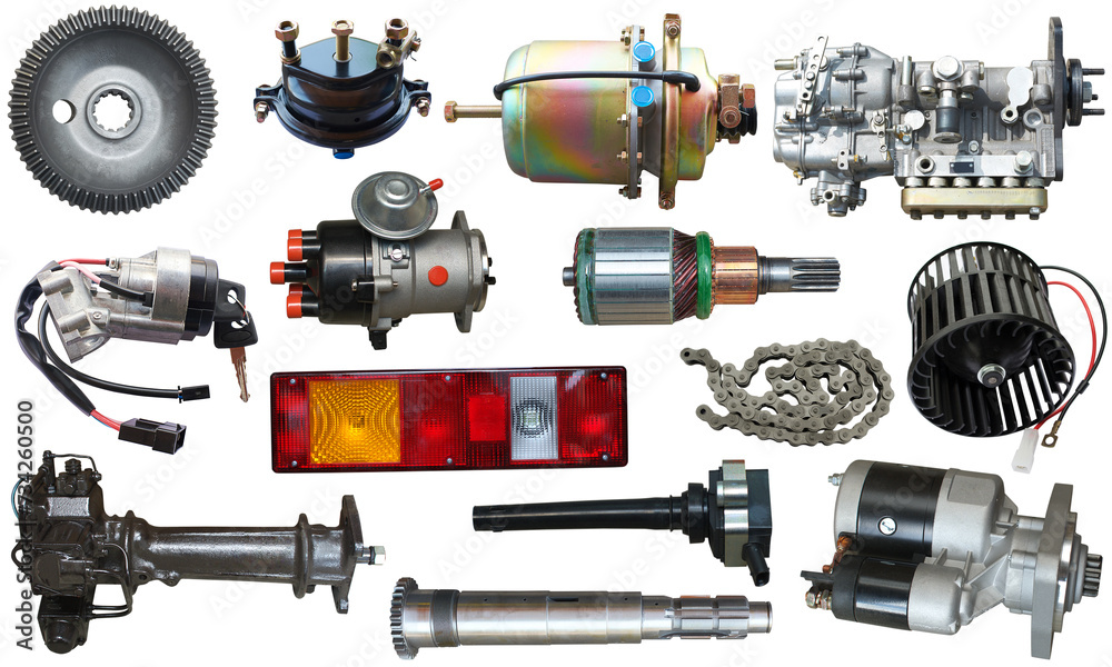 Auto spare parts car on the white background. Set with many isolated items for shop or aftermarket