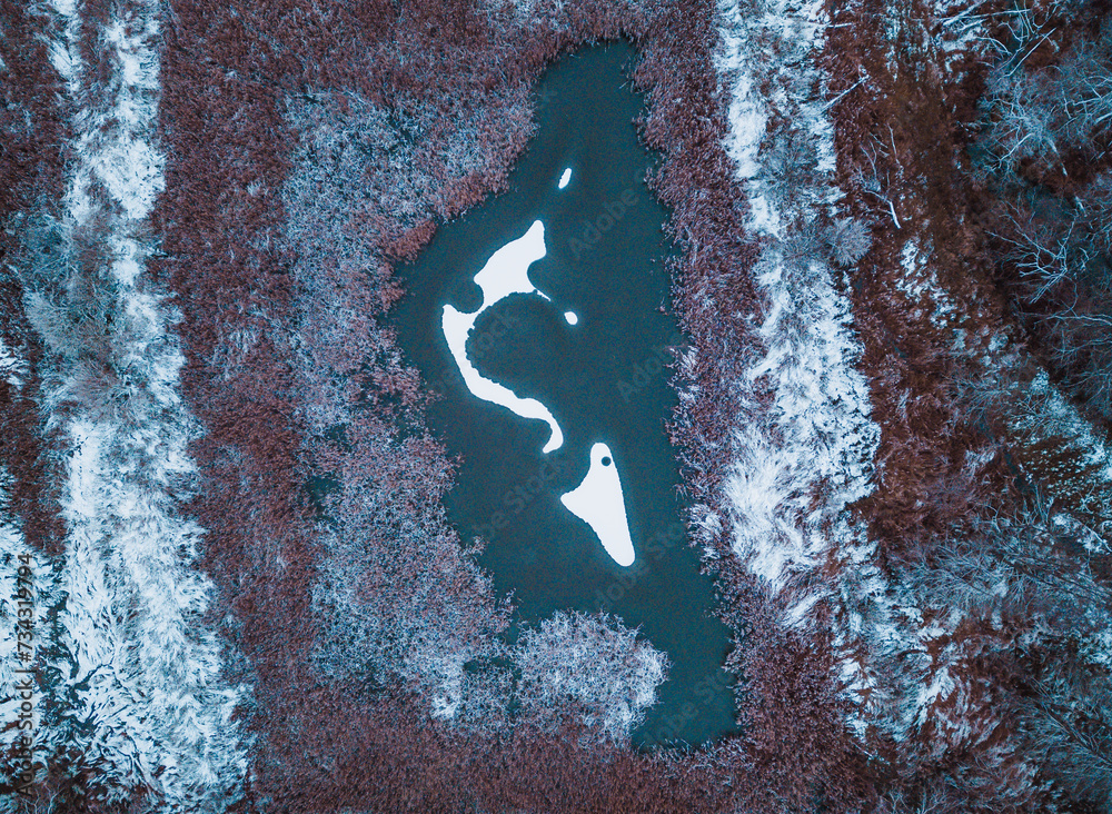 Winter top down view from a drone on pond and forest