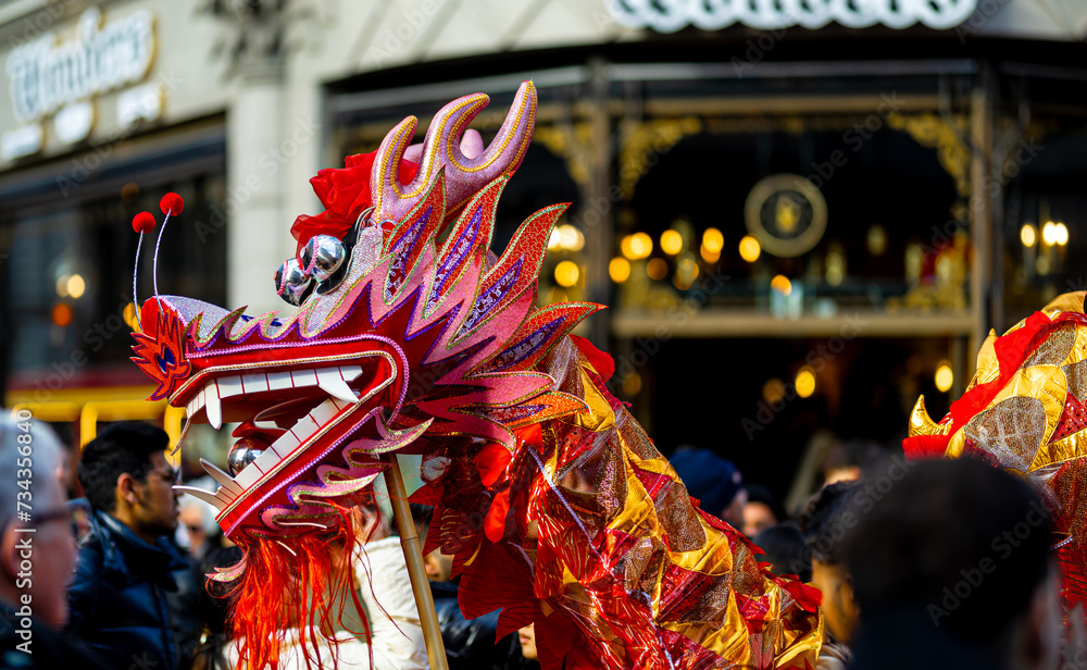 Dragon dance during Chinese lunar year celebrations in London, England