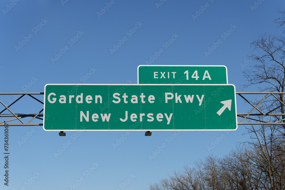 sign on I-287 I-87 Governor Thomas E. Dewey Thruway in Chestnut Ridge, New York for Exit 14A to the Garden State Parkway in New Jersey