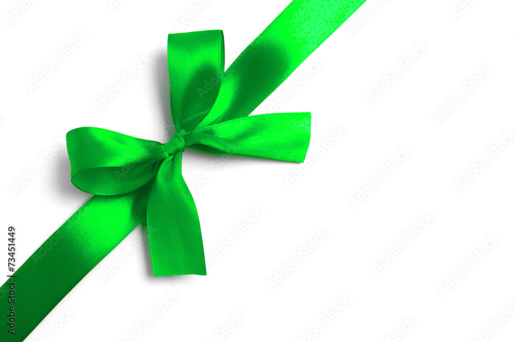Shiny green satin ribbon on white background