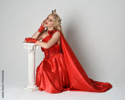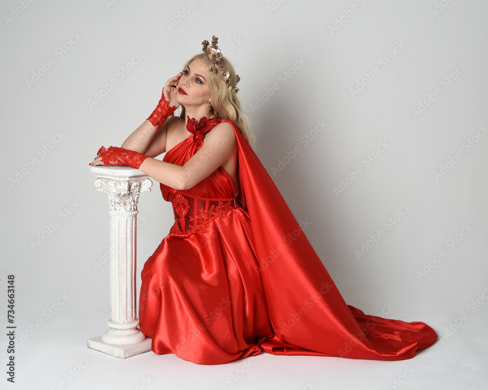 Full length portrait of beautiful blonde model dressed as ancient mythological fantasy goddess in flowing red silk toga gown, crown. kneeling pose with greek column, isolated white studio background