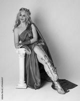 Full length portrait of beautiful blonde model dressed as ancient mythological fantasy goddess in flowing red silk toga gown, crown. kneeling pose with greek column, isolated white studio background