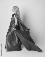 Full length portrait of beautiful blonde model dressed as ancient mythological fantasy goddess in flowing red silk toga gown, crown. Walking away from camera, isolated on white studio background.