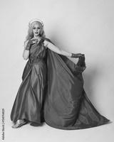 Full length portrait of blonde model dressed as ancient mythological fantasy goddess in flowing red silk toga gown, crown. elegant dancing pose with flowing fabric isolated on white studio background