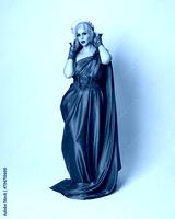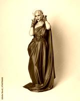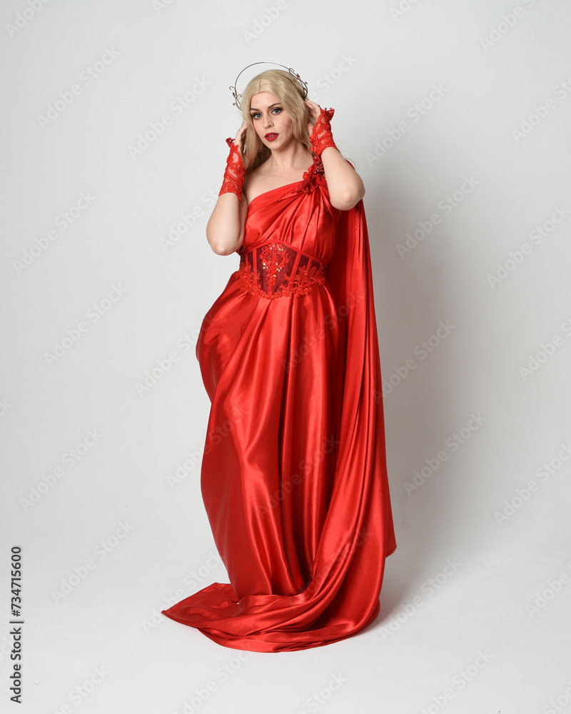 Full length portrait of blonde model dressed as ancient mythological fantasy goddess in flowing red silk toga gown, crown. elegant dancing pose with flowing fabric isolated on white studio background