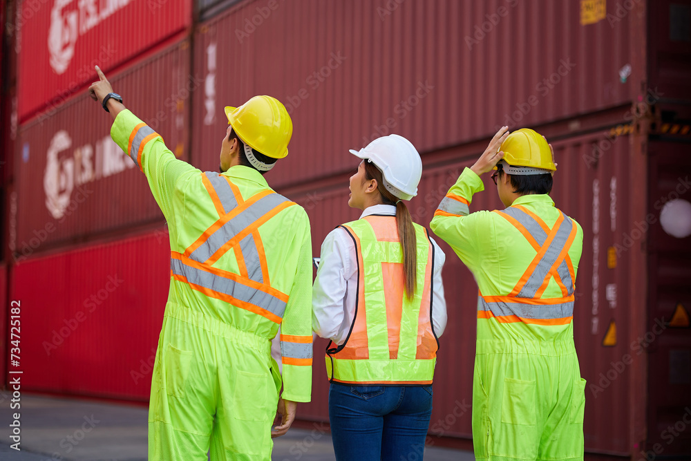 back view workers looking and pointing above in containers warehouse storage