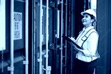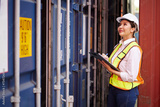 worker or engineer writing on clipboard and checking containers in warehouse storage