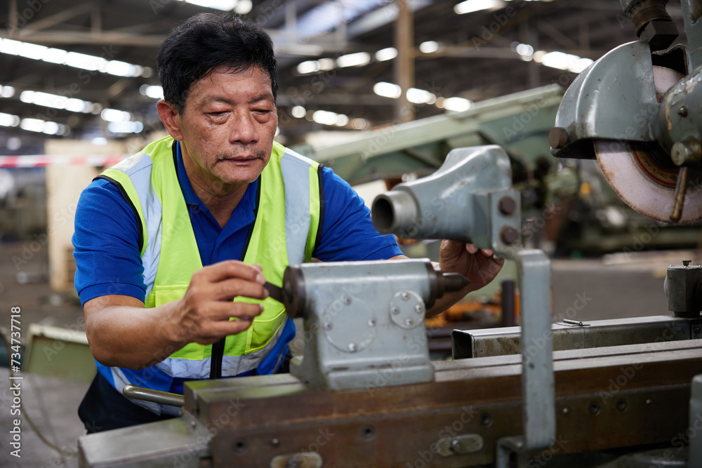 technician or worker checking and control lathe machine in the factory