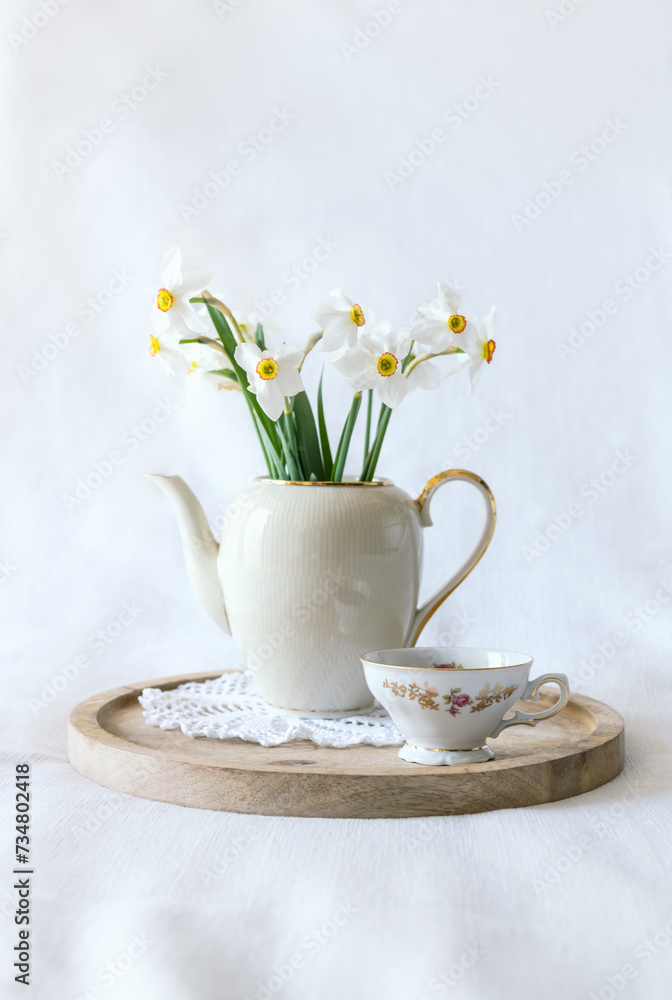 Still life with a blooming bouquet of white daffodils in an elegant porcelain teapot on a textured white background