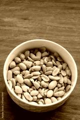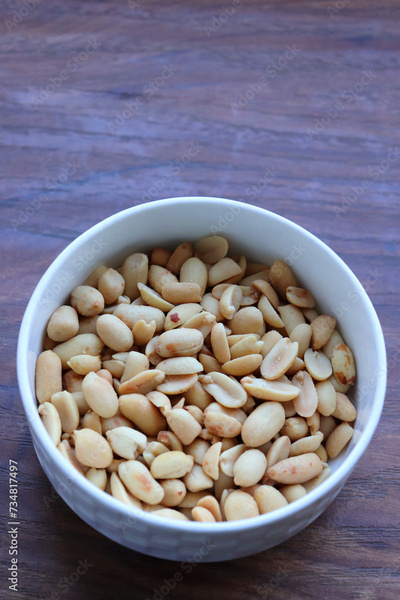 Roasted and salted Peanuts in a white bowl, also called groundnut, Shengdane, mungfali, and goober. Popular party snack. Copy Space.