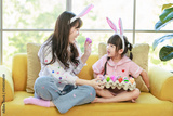 Happy asian cute little children girl wearing bunny ears headbands and young happy mother smile, play with eggs while sitting together on sofa in living room during preparation for Easter holiday