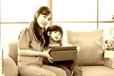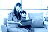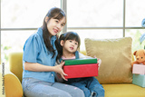 Happy mother's day Asian little cute girl child congratulating mom. Young mother and daughter smiling and holding gift on yellow cozy sofa in living room at home, Family holiday and togetherness.