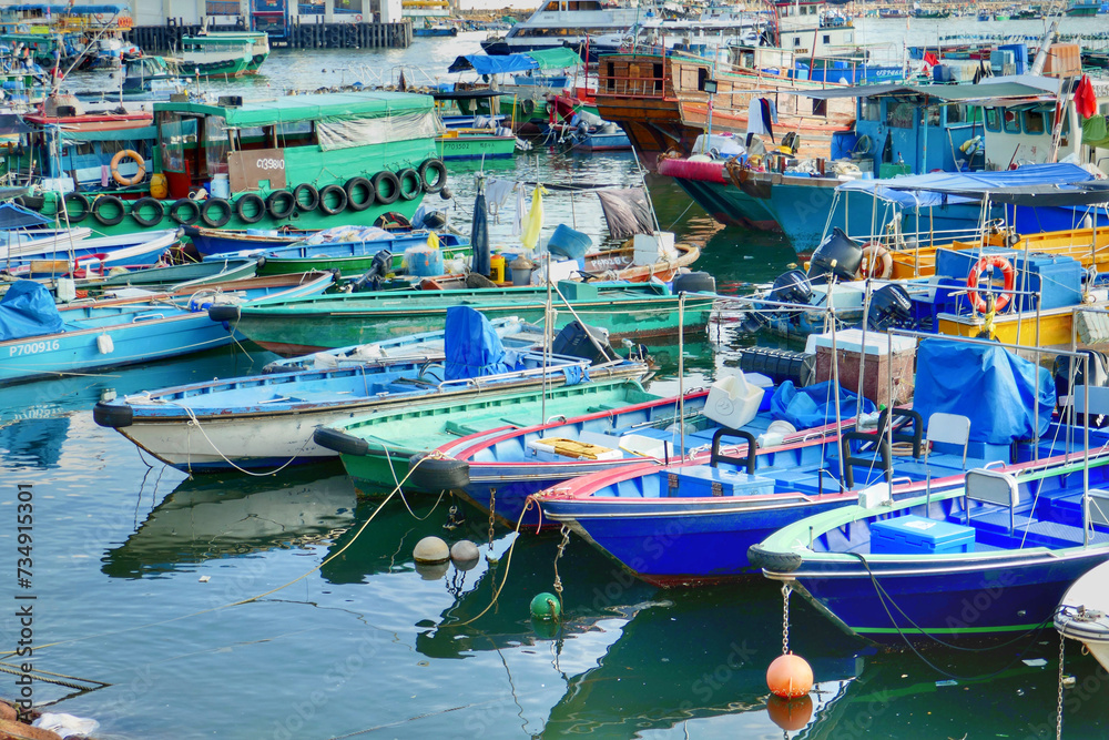 Moored fishing boats in Cheung Chau Harbor, Hong Kong
