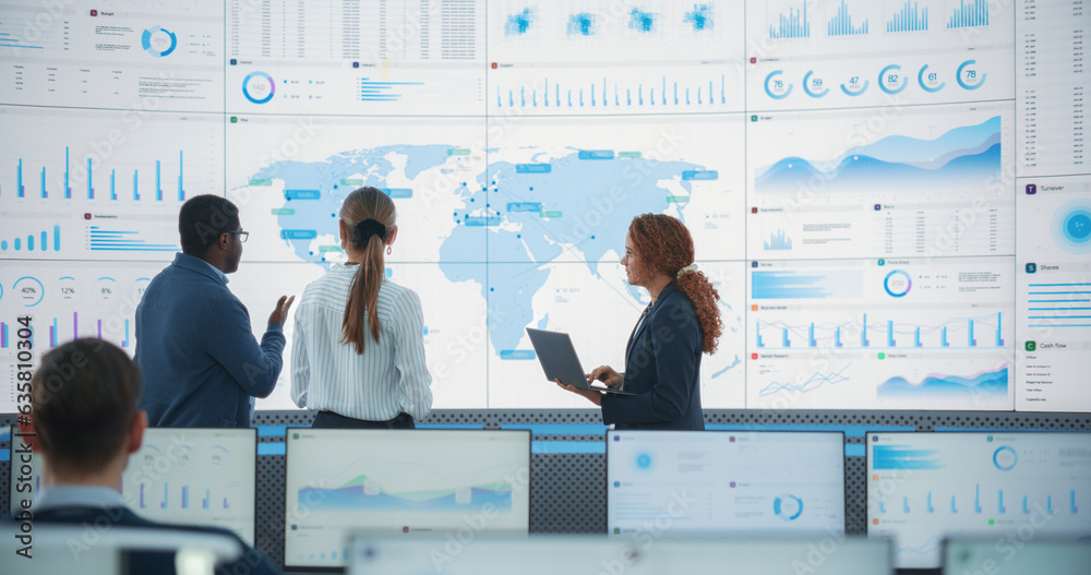 Vertical Plant Farm Specialists Talking on a Cargo Elevator with Fresh Basil Crops. Female and Male Farmers Working Indoors. Aerial Portrait with Hydroponics Farm in the Background