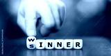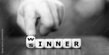 Hand turns dice and changes the word sinner to winner. Symbol for stop being a sinner and become a winner.
