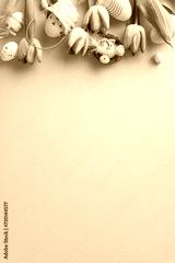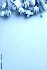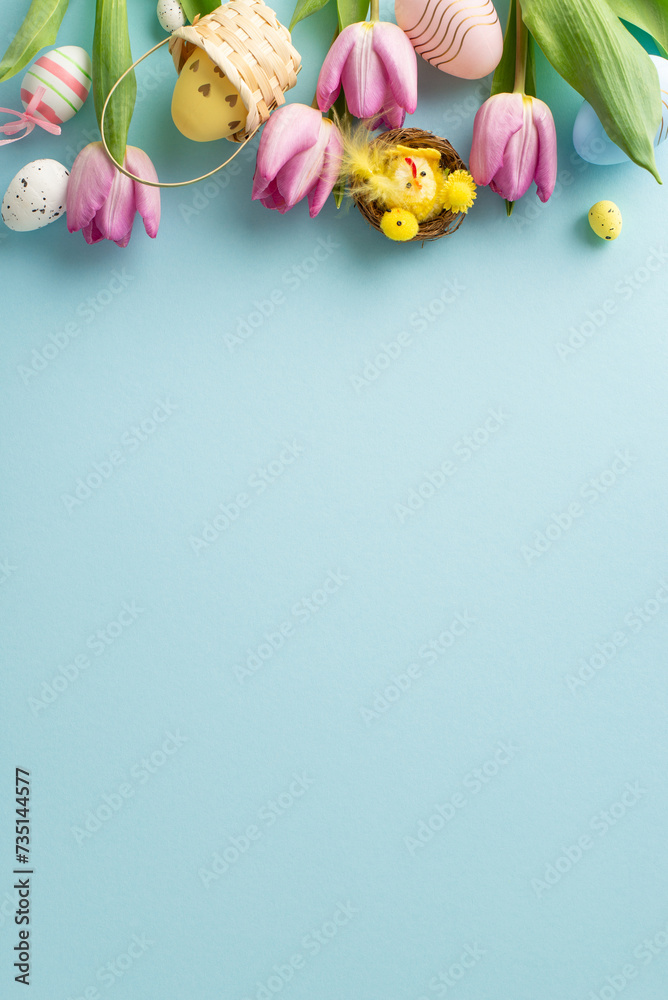 Easter whimsy: vertical top view of cheerful eggs in small basket, nest, chicken, and tulips on a serene pastel blue background. A delightful scene for conveying Easter greetings or promotions