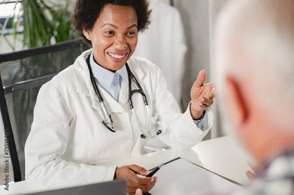 Doctor specialist consulting a patient in a doctor's office at a clinic. Female doctor is talking with a male elderly patient.