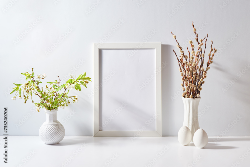 Mockup with a white frame and spring flowers in a vase, easter eggs on a light background. Empty poster frame mockup for presentation design, text, lettering