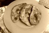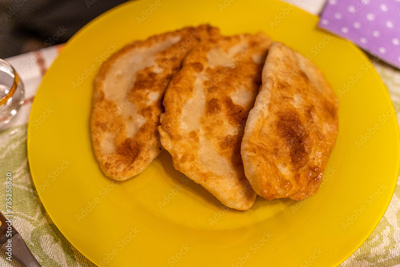 Fried Chebureks with meat on a yellow plate. Traditional food.
