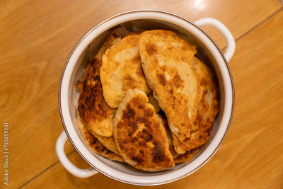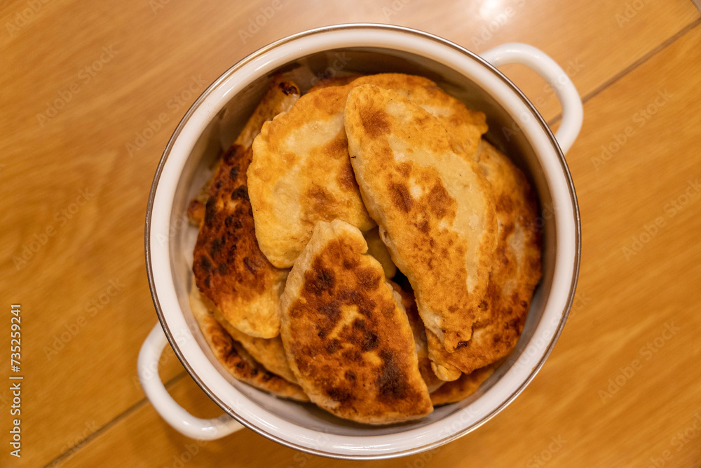 Freshly cooked homemade Fried Chebureks with meat in a bowl. Traditional food.