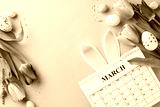 Easter's delicate dance: tulips and traditions. Top view of tulips in, assorted Easter eggs, and playful bunny decorations, calendar on teal backdrop with space for celebratory messages