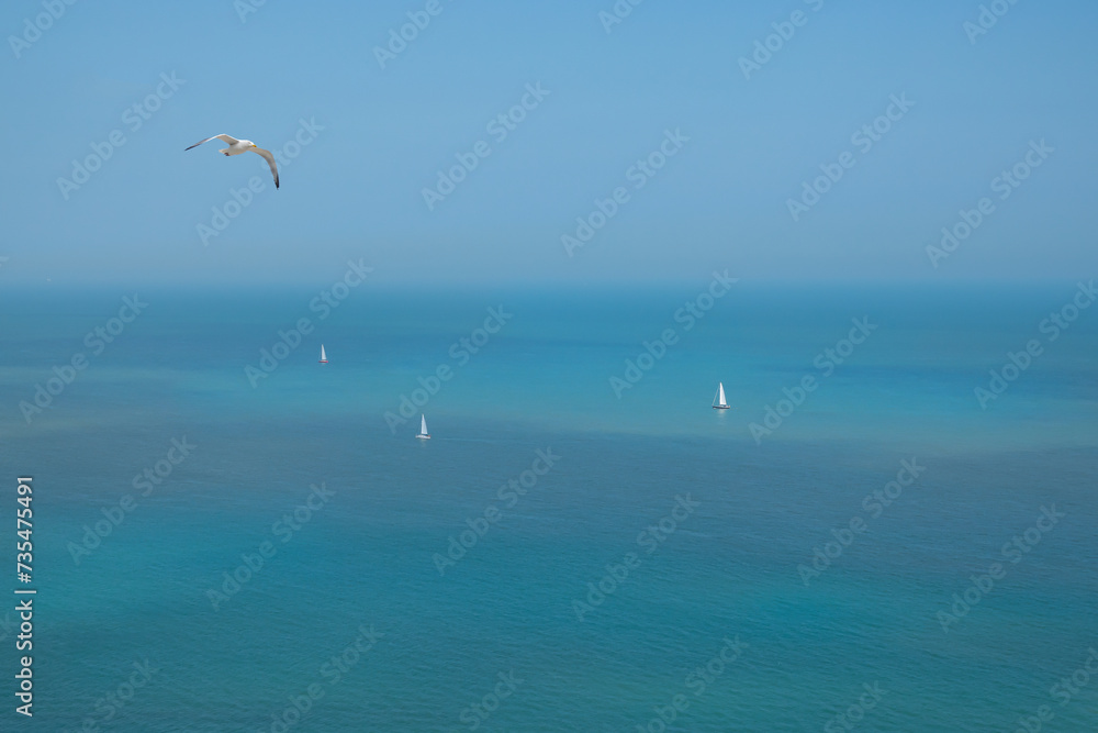 Serene seascape view with sailing boats and flying seagull on a clear sunny day