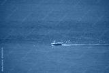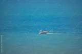 A fishing boat is followed by a flock of seagulls while sailing the blue sea
